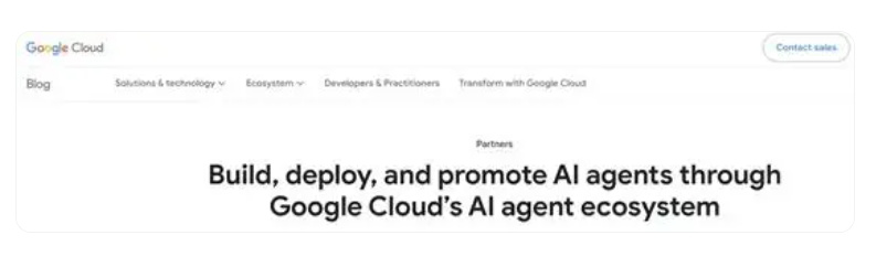 谷歌云通过各种市场资源,例如,广告和活动,提高合作伙伴AI Agent的知名度,并通过博客和专门的活动展示合作伙伴的明星级产品,增加AI Agent的曝光率,帮助合作伙伴在竞争激烈的AI Agent生态系统中脱颖而出。